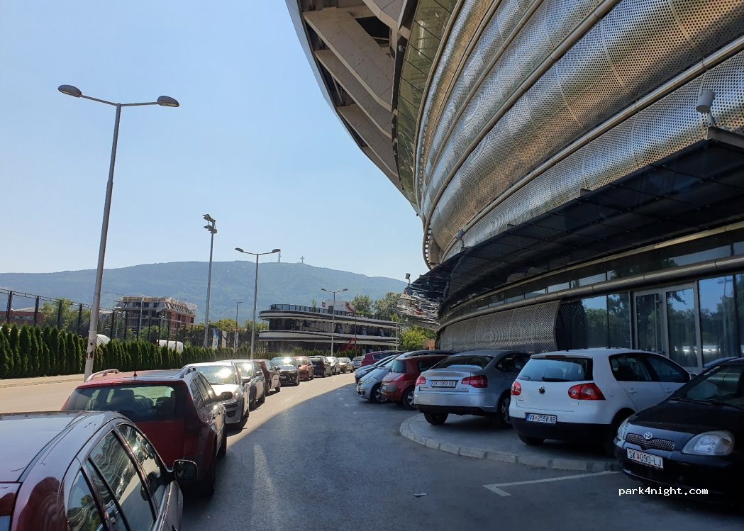 Nice parking, close to city centre. just be cautious that you do not park on the left parking (with ramp-closer to stadium-it was open at the evening but closed in morning so we had to go to reception of stadium and security guard had to open it-but with no problem, we had a really nice and interesting chat). buildings in skopje are very beautiful and food cheap