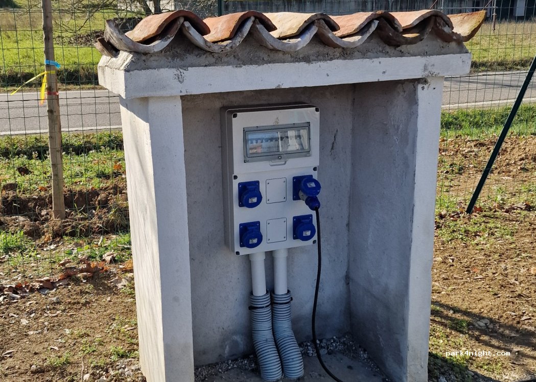 Pulizia, ampiezza stalli, c/s, posizione da 5 stelle. Approvvigionamento corrente ha qualche problema, forse colpa della presa, ma è saltata 2 volte. Poi abbiamo abbassato il generale e cambiato presa e dopo ha funzionato. Pagamento previsto monete (anche piccolo taglio, dai 10c) e carta, ma oggi dava sempre errore connessione. Rete cellulare tim molto scarsa, iliad buona. Posto consigliato