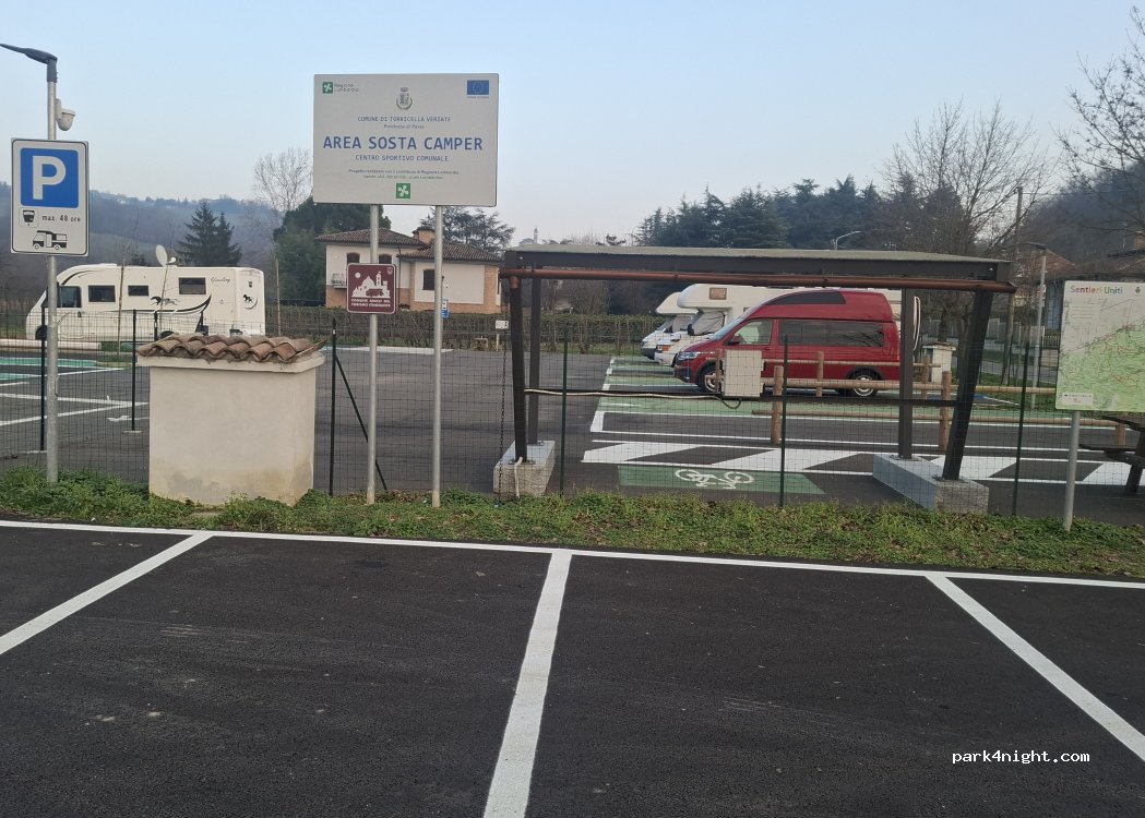 Nuovissima area camper , 4 posti , non si può prenotare. Corrente , acqua potabile , scarico acque grigie e Wc. 10 euro per 24 ore. All’intento dell’area piccoli cestini per piccoli rifiuti , comodi all’esterno si trovano i bidoni per la raccolta differenziata. 15 minuti a piedi per far visita al santuario di Santa Maria della passione e la scala Santa. Grazie a Torricella Verzate per l’ospitalità.
