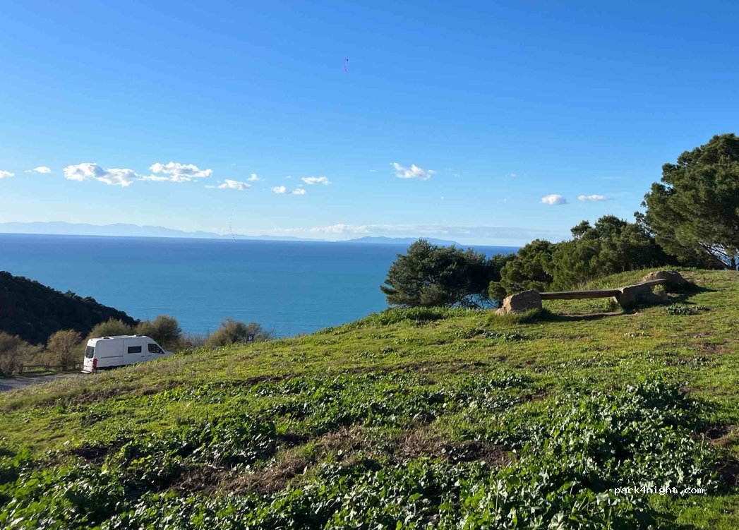 Bellissima vista sul mare, tramonto memorabile e posto accogliente. Utilizzabile per dormire probabilmente in bassa stagione oppure arrivando molto tardi. Domenica sera di luglio alle 22 era ancora strapieno e con un via vai di auto continuo, e non tutti i parcheggi sono in piano. È l'unico parcheggio di Populonia, che si visita davvero in fretta, non ci siamo fermati a dormire.