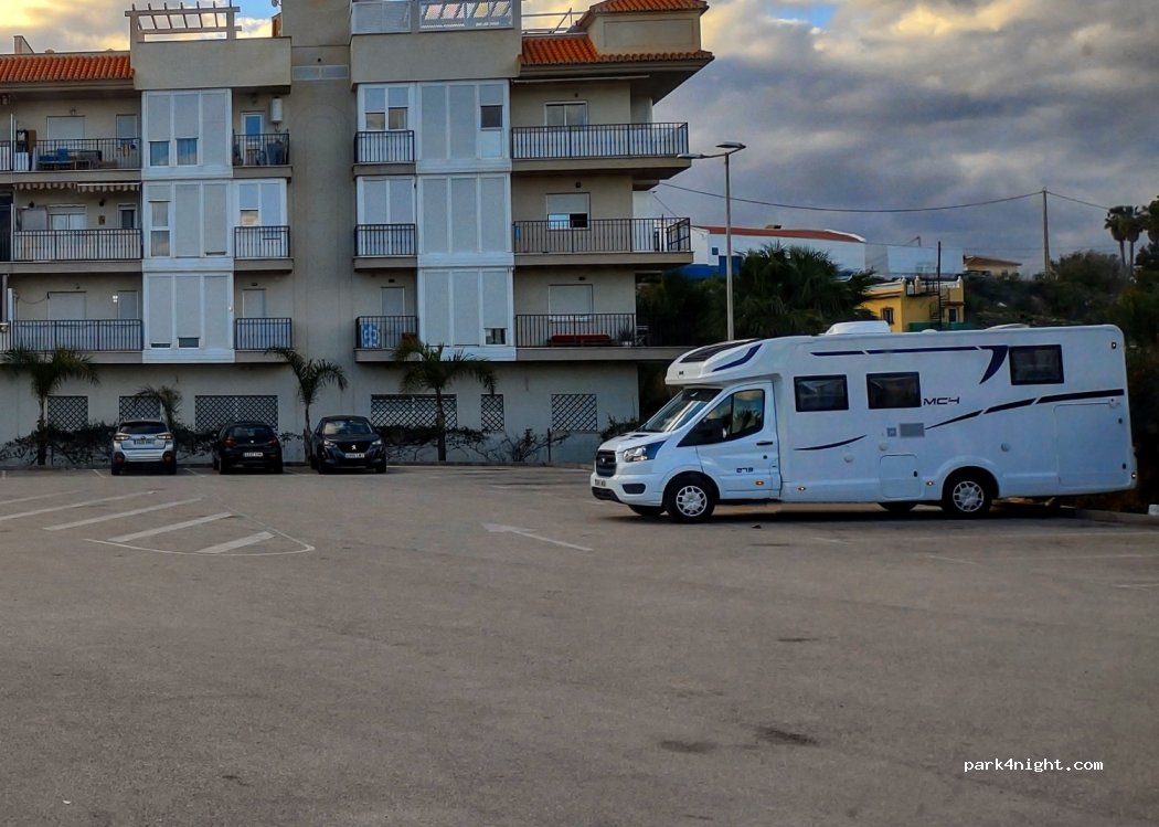 Tarmac carpark, ideally suited for the smaller van. Lidl supermarket opposite. within eady reach of beach promenade and restaurants. Road noise but quiet after about 11pm until 6am approx. Would recommend for overnight.