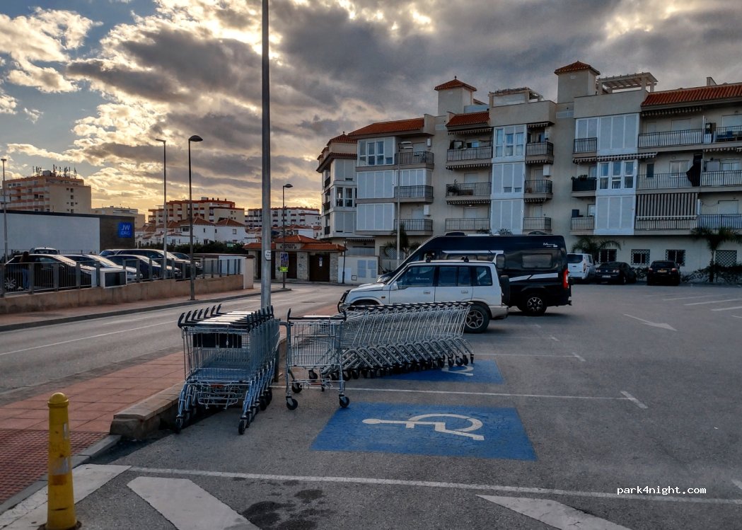 Parkeerplaats naast de Lidl. 10 minuten lopen naar strand en restaurants. Ruime vlakke parkeerplaats, geen voorzieningen maar ik voelde me er veilig. Je hoort uiteraard wel auto's rijden zo midden in de stad maar dat stoorde me niet.