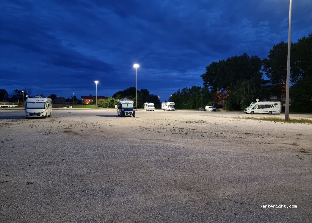 Ampio parcheggio in piano, sterrato o erba. Eccellente, appena fuori dal centro (circa 2 km), si arriva tramite comoda pista ciclo-pedonale. Nessun servizio ma la notte abbiamo dormito bene nel silenzio. Consigliato per visitare la città.