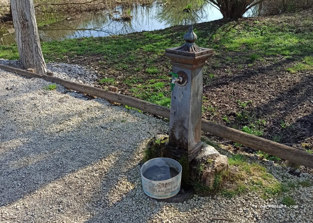 Robinet fileté. Pas facile d’accès ( pas de place pour se garer). Nous avons mis les warning car on empietait sur la route. débit moyen.