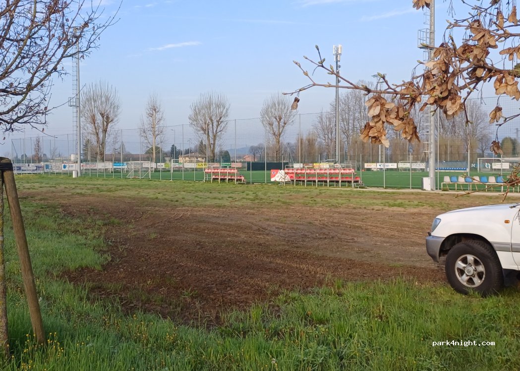 Parcheggio tranquillo accanto al campo sportivo, zona sterrata, prati e asfalto, adatto anche per roulotte.
