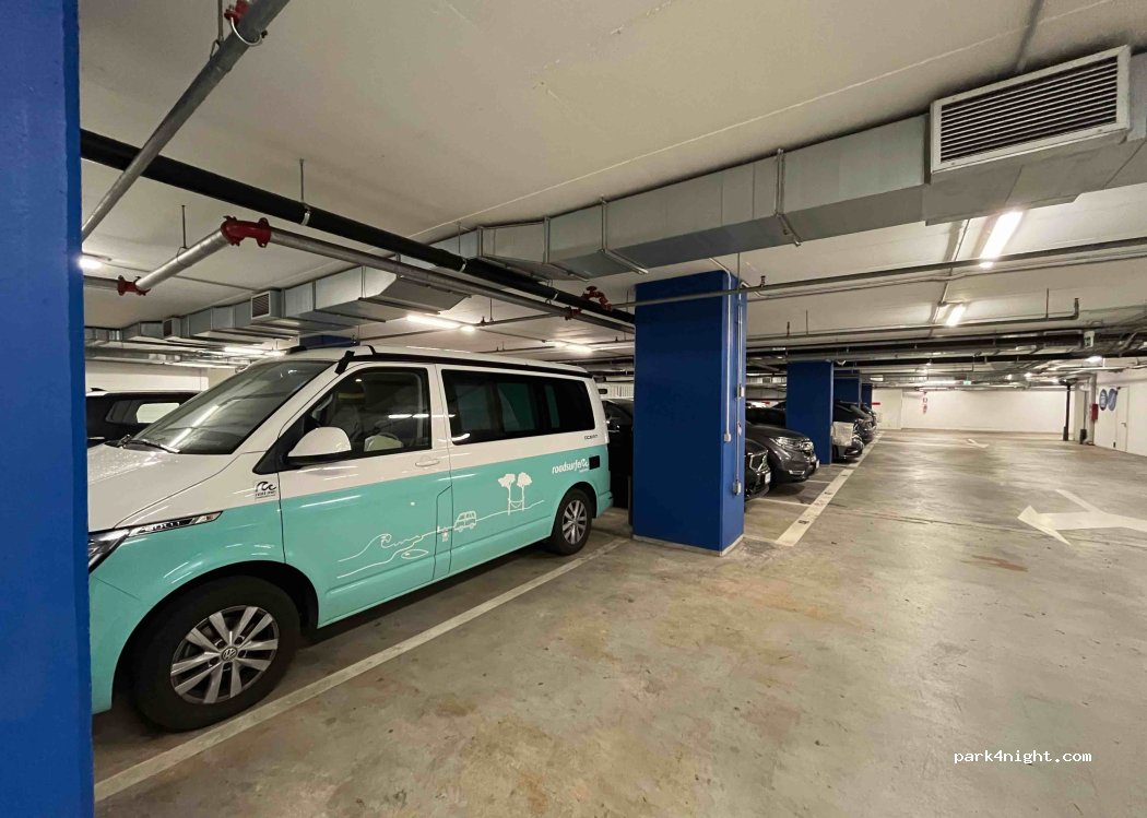 Sicheres Parkhaus für 15€ pro Tag. Ich empfehle jedoch in den tieferen Stockwerken zu parken da es in -2 sehr warm war. Um Nachts über den Aufzug ins Parkhaus zu kommen braucht man sein Parkticket!