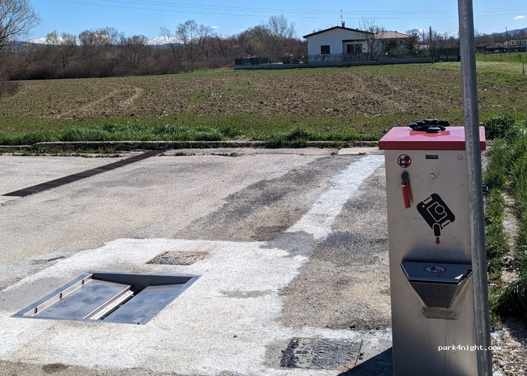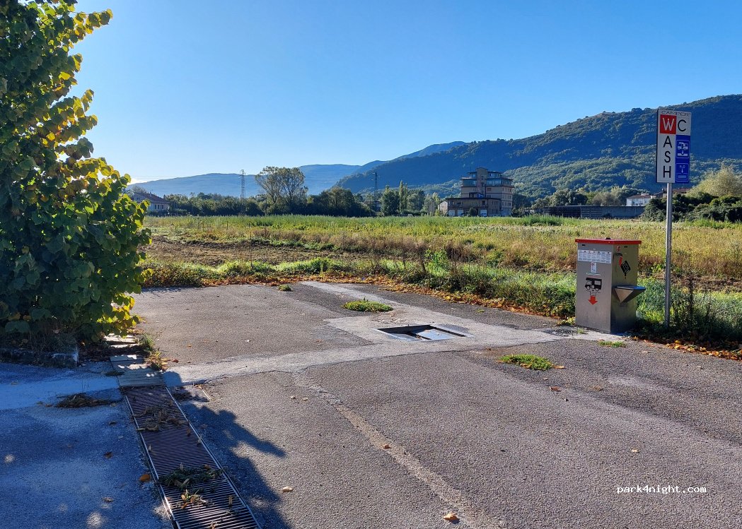 abbiamo dormito qui, notte tranquilla e scarico nere e grigie pulito, l’acqua c’è bisogna premere il pulsante della colonnina e’ potabile