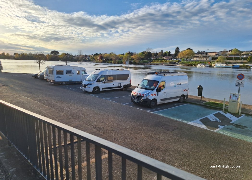 Small parking lot on the banks of the Lot, no prohibition. Not far from the bridge so a little noisy during the day. Right next door, bakery, pharmacy, café, butcher... We slept well there.