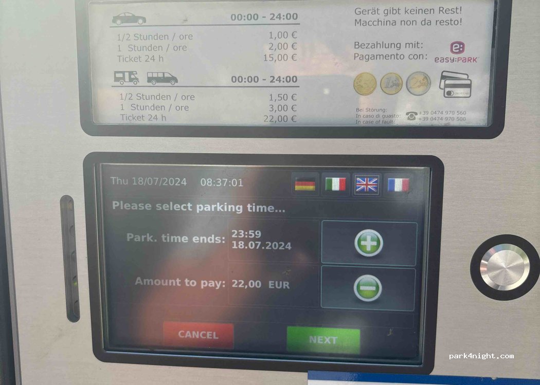 Super zum parken, 24 Stunden kosten 22€. Allerdings ist über Nacht stehen nicht empfohlen. Paar 100m weiter ist der drei zinnen Parkplatz sehr gut zu übernachten