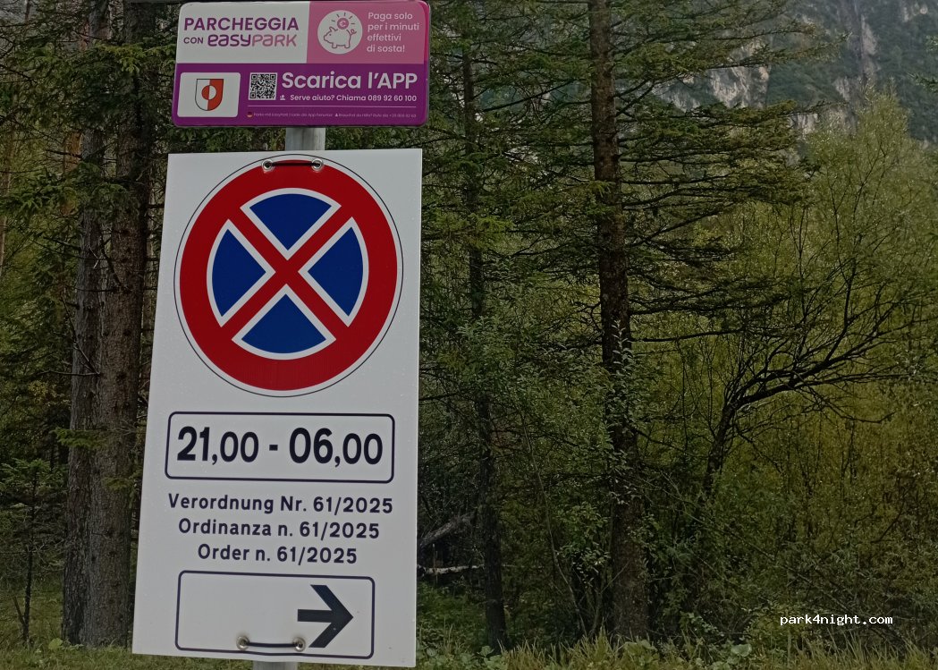 Nous sommes en basse saison et nous dormons au bord du lac cette nuit. Nous sommes sur la droite de la route juste en arrivant sur le lac il y a de la place juste après le panneau indiquant "lago di Landro" aucun panneau d interdiction ... la route est très passante le jour la nuit ça devrait être plus calme...