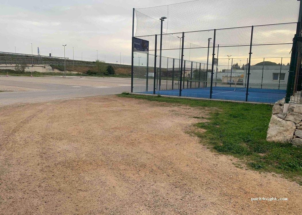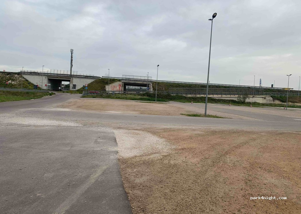 Très grand parking pavé plat adjacent à de belles installations sportives. Juste à côté d'une autoroute très fréquentée, donc il y a beaucoup de bruit de la route. Aucun panneau d'interdiction et il est peu probable que vous dérangez qui que ce soit dans un si grand terrain.