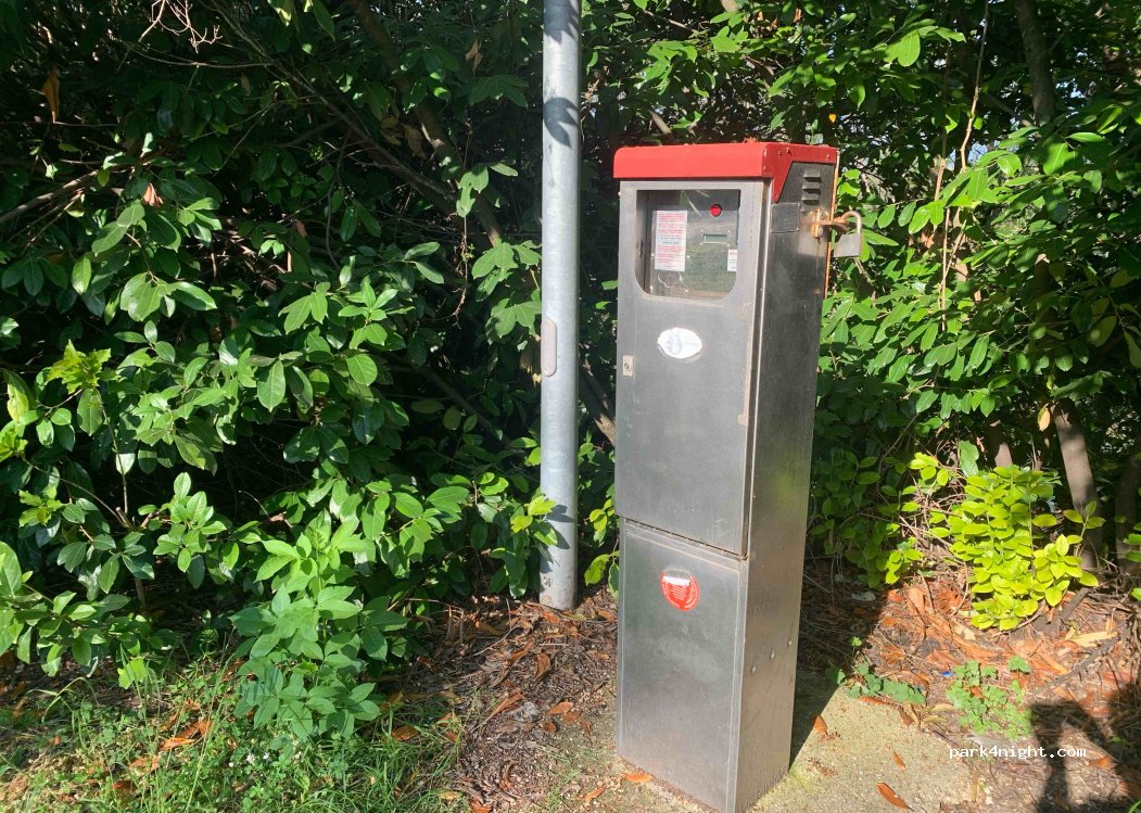 Ein spezieller Parkplatz für Wohnmobile, aber ohne viele Serviceleistungen. Nur Mülleimer und Picknickbänke. Obwohl es ganz in der Nähe einen anderen Ort gibt, sieht dieser auf den Fotos definitiv anders aus. Hier gibt es ebene Parkplätze auf Gras, die durch Holzzäune mit kleinen unbefestigten Zufahrtsstraßen getrennt sind. Meistens nicht beschattet, aber einige schattig. Ein Schild am Eingang warnt vor Schlamm nach Regen. Es gibt einen Stromanschluss – aber nicht funktionsfähig (im April 2024)