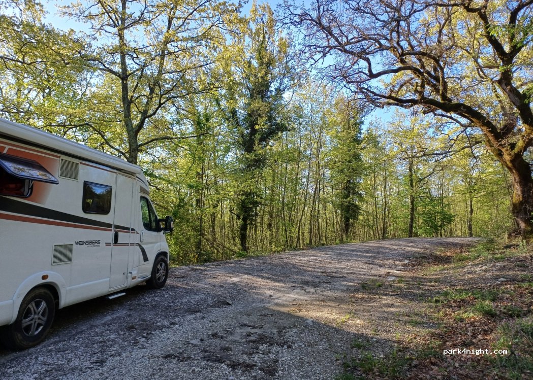 On the SS439, about 20km north of Massa Marittima, there are old stretches of road that lead in a curve around the new route. We spent the night on one of these stretches, and it will also be possible on others if they are not being used as a wood storage area.