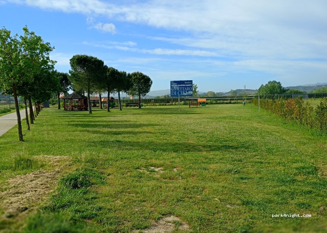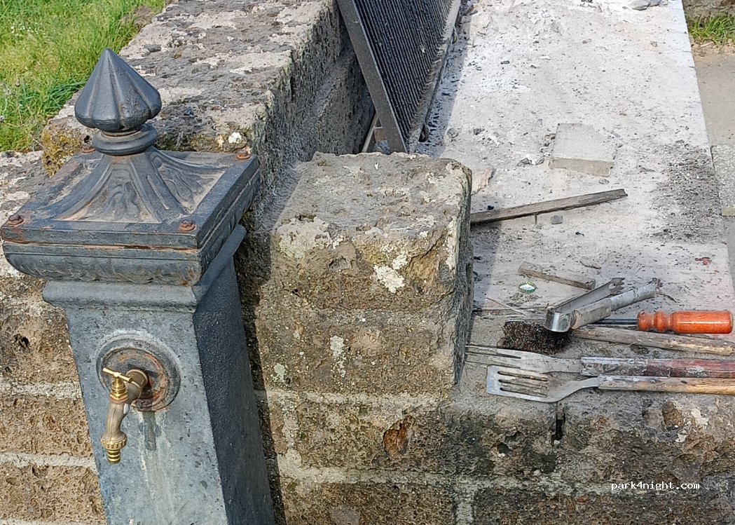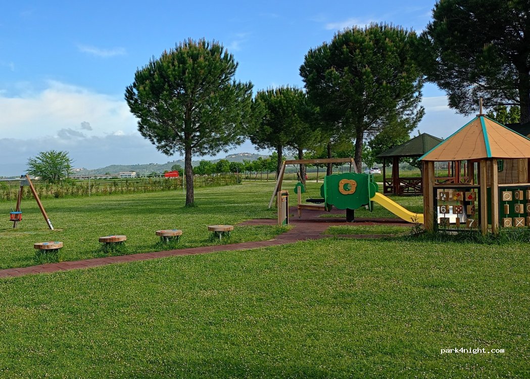 parcheggio misto su erba per 50 mezzi con parco giochi, zona tavoli, barbecue, fonte e bagno automatici a pagamento.