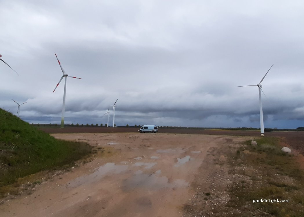 Grand parking plat en gravier sous une éolienne. Très calme de jour comme de nuit. Aucune maison à proximité. Petite route de campagne visible mais peu de circulation. Il n'y avait que du vent léger donc la turbine ne nous a pas dérangés. Aucun panneau d'interdiction, juste un avertissement de ne pas y aller en hiver, lorsque la glace peut tomber. Cette zone regorge d'éoliennes...