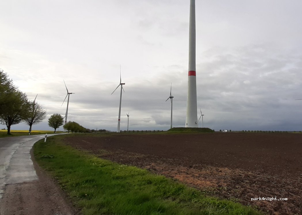 Großer ebener, geschotterter Parkplatz unter einer Windturbine. Sehr ruhig tagsüber und nachts. Keine Häuser in der Nähe. Kleine Landstraße sichtbar, aber nicht viel Verkehr. Es war nur leichter Wind, also hat uns die Turbine nicht gestört. Kein Verbotsschild, nur eine Warnung, im Winter nicht zu gehen, wenn Eis fallen kann. In dieser Gegend gibt es viele Windturbinen ...