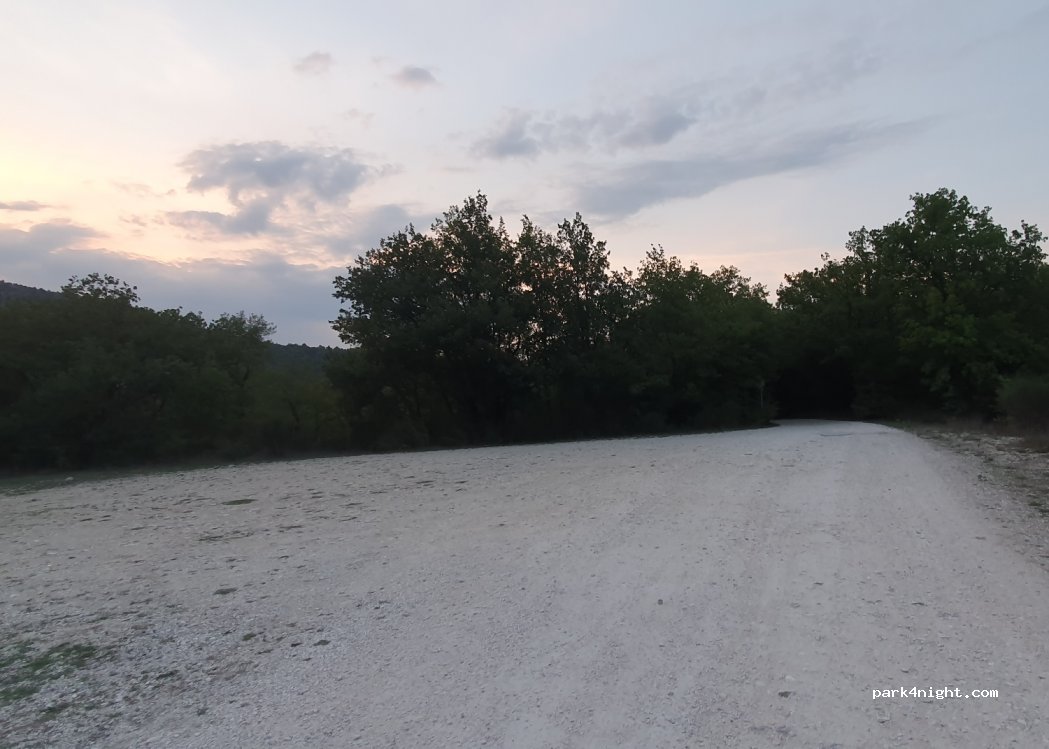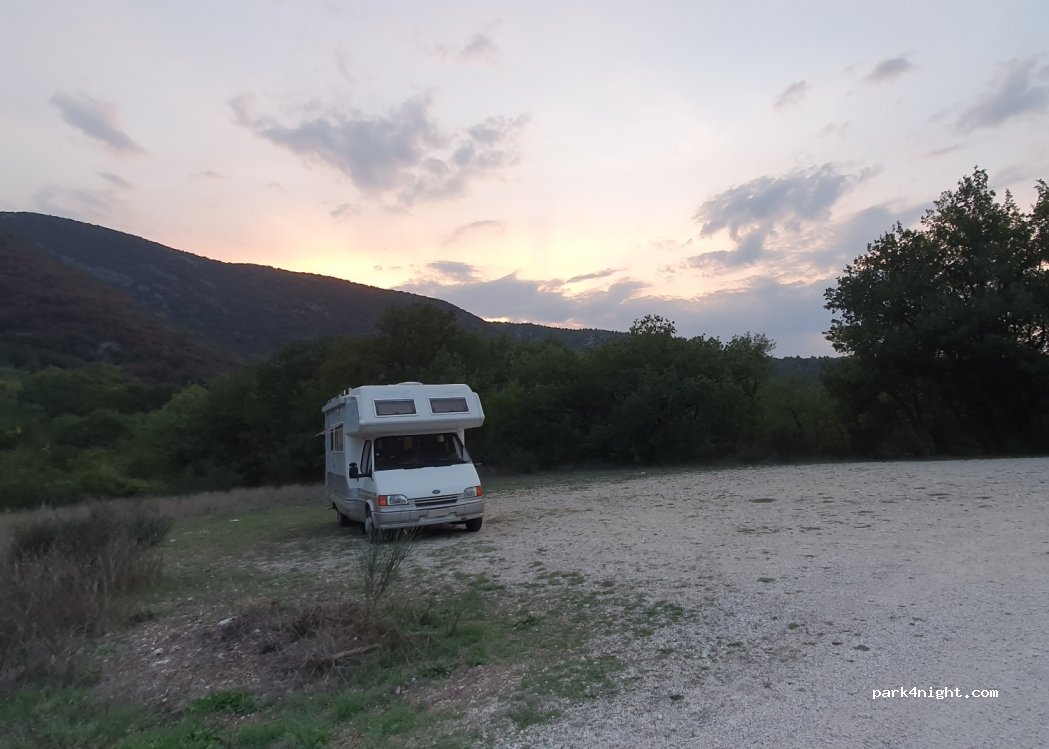 Large dirt clearing next to the dirt road that leads to San Pietro ad oratorium. No service. Just peace and quiet. On foot or by bike you can easily reach the banks of the Tirino river, while next to the church of San Pietro there is a beautiful shaded picnic area.