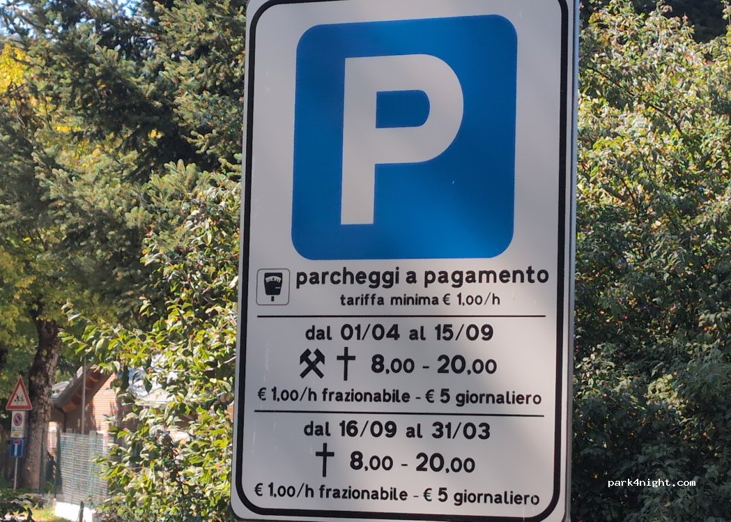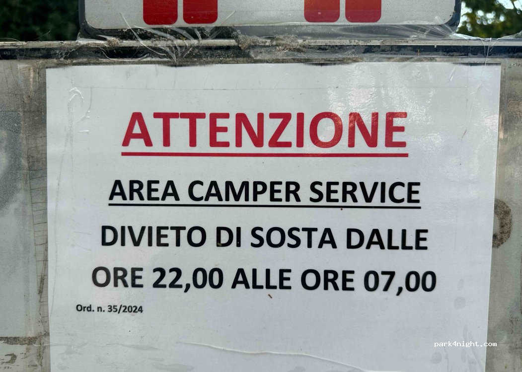 Area sosta camper solo diurna a pagamento con parcometro pubblico, 5 euro per l intera giornata, acqua potabile e scarico acque nere, sosta vietata dalle 22 di sera alle 7 del mattino…