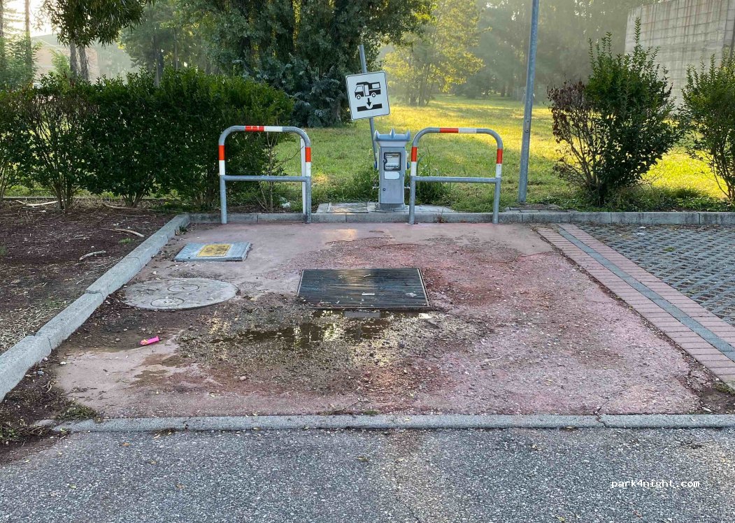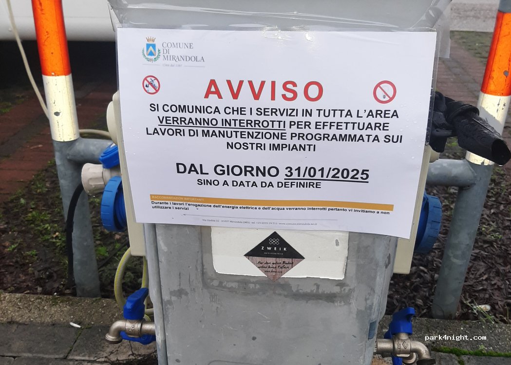 Mirandola. Fully equipped area with electricity, water, and individual toilet waste. Empty sewage. Very quiet location near a small park. From January 31, 2025, the area will be closed for maintenance until further notice. Power will not be restored anytime soon, as confirmed by the Municipality.