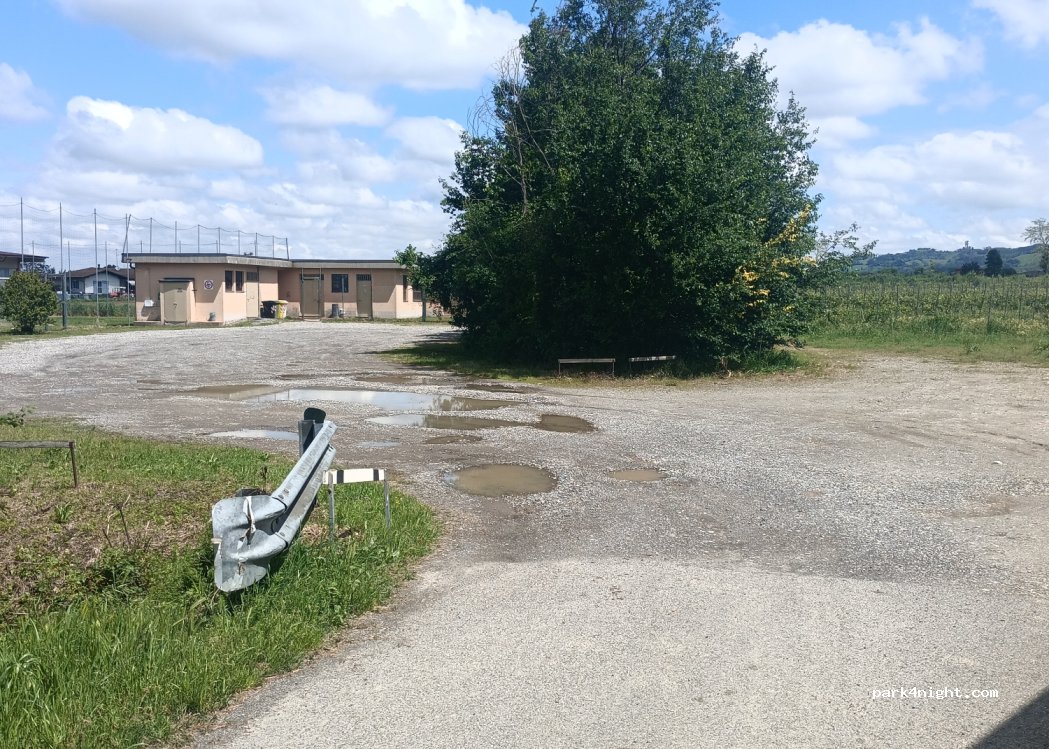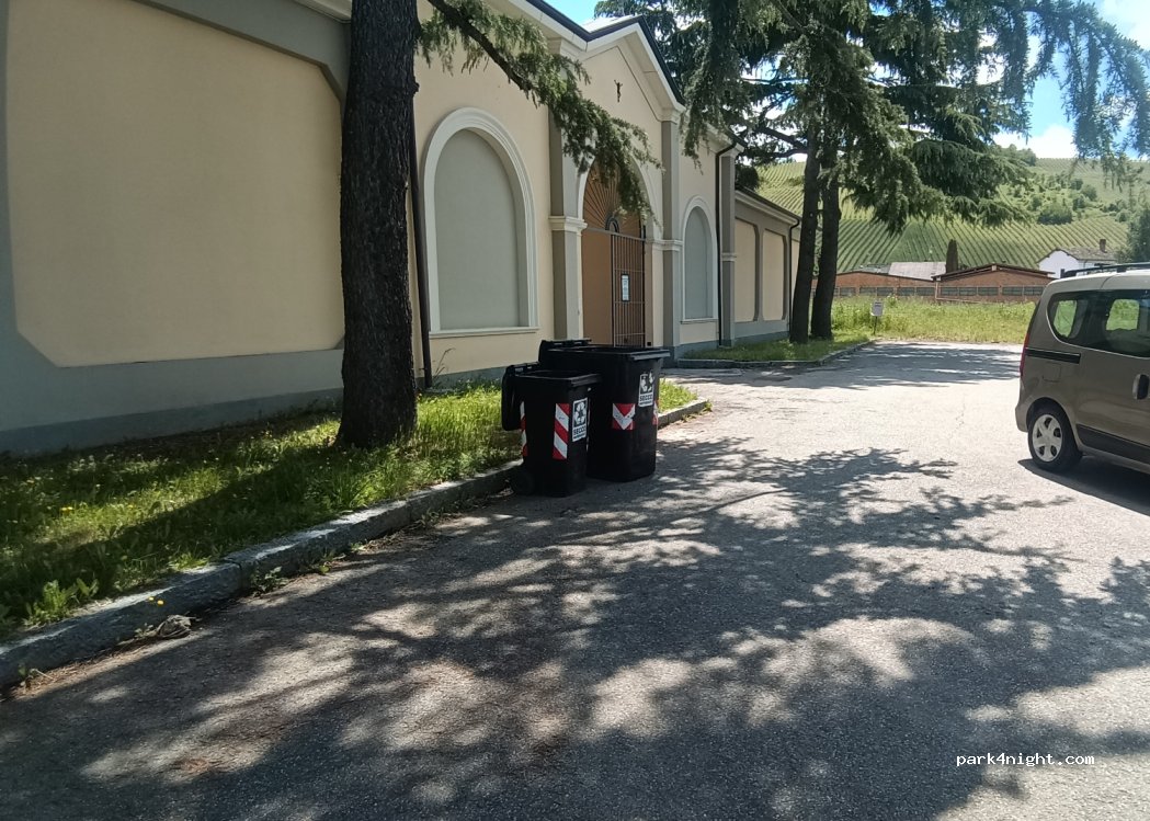Parcheggio del campo sportivo e del cimitero adiacente, relativamente tranquillo. A poca distanza si trova anche il parcheggio dell'enoteca, ma è molto vicino alla statale.