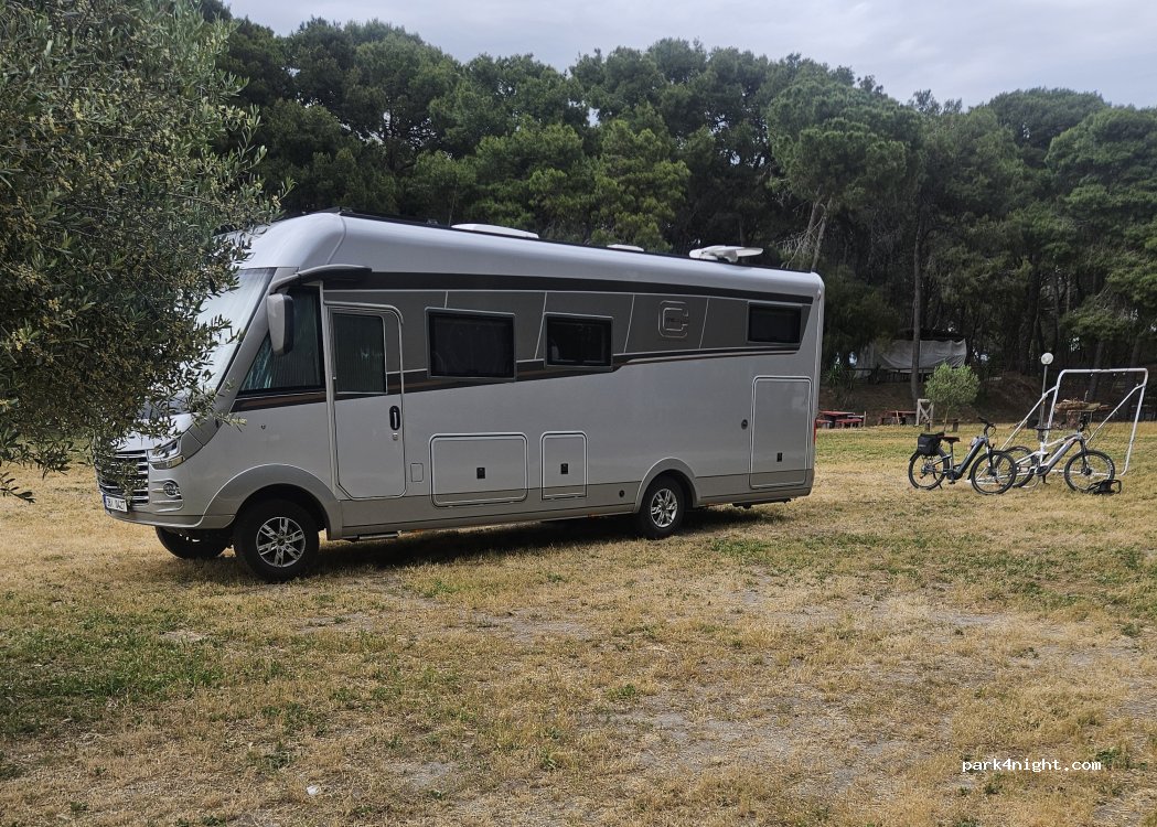 Un camping un peu vieillot et vide mi septembre mais ombragé dans une pinède et la plage est toute proche à pied. La propriétaire est très gentille et la douche est chaude. De toute façon nous n’avions rien trouvé de mieux dans ce coin. 20€ pour une nuit à deux avec notre van. Je recommande pour une nuit au calme