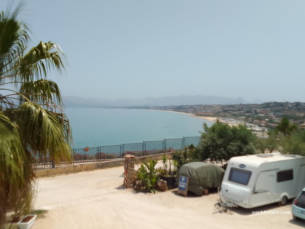 Kleiner schattenloser Parkplatz hoch über der Bucht von Castellammare. Der Sanitärbereich, soweit man davon sprechen kann, ist sehr rudimentär. Es fehlt ein Bodeneinlass zum Entsorgen. Haben pro Nacht 10 € ohne Strom bezahlt. Strom kostet 3 € extra. Haben den Platz für Ausflüge mit dem Roller nach Segesta und zum Zingaro Park genutzt. Castellammare ist eine Besichtigung wert.