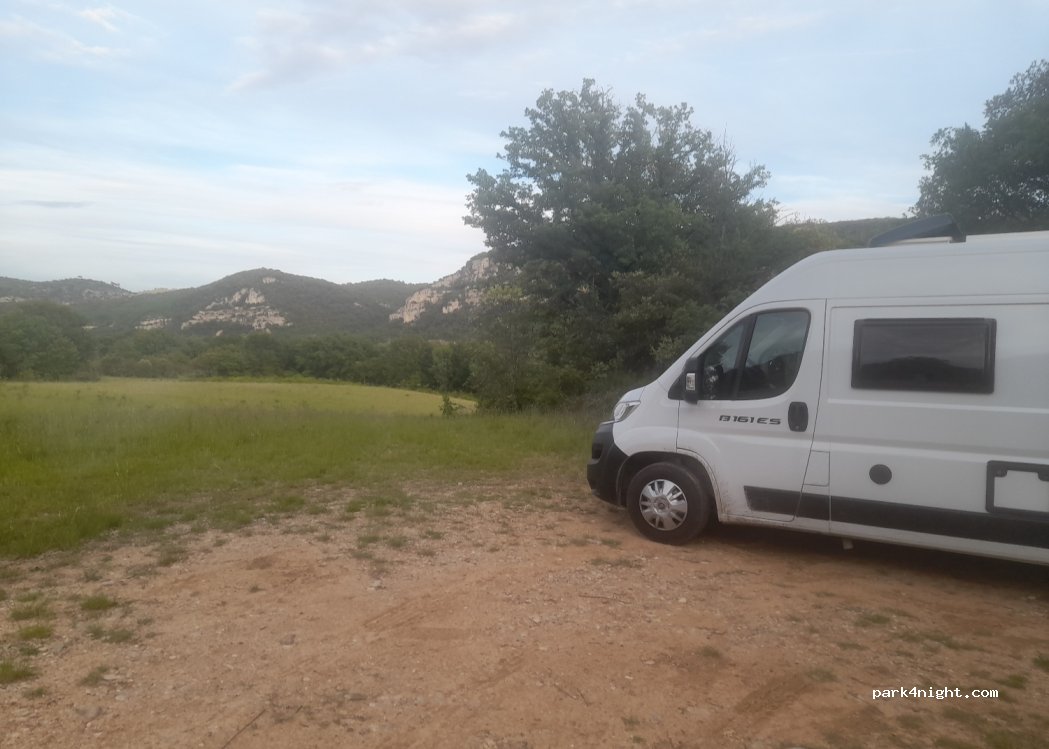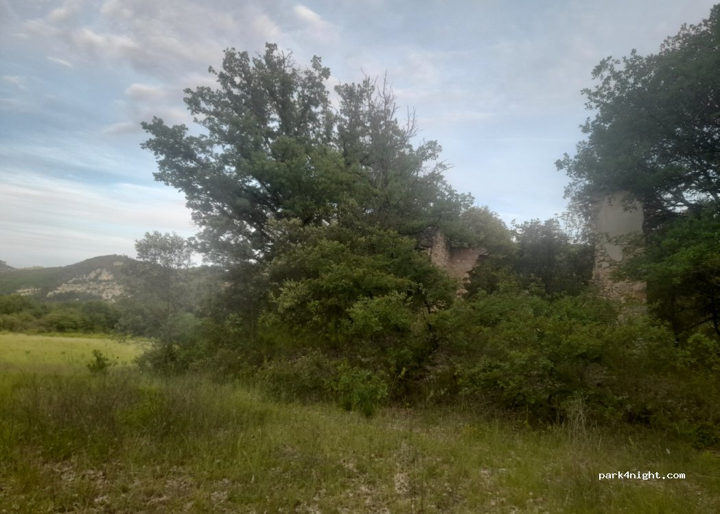 Een ruime plek naast, maar weg van de baan naast een kleine ruïne.