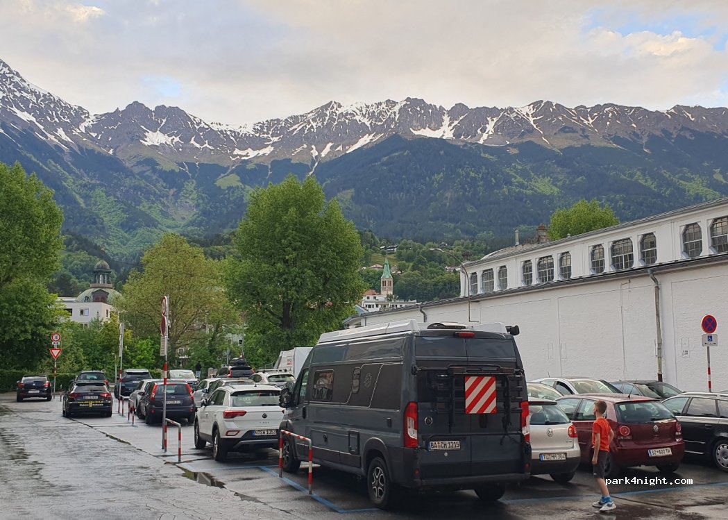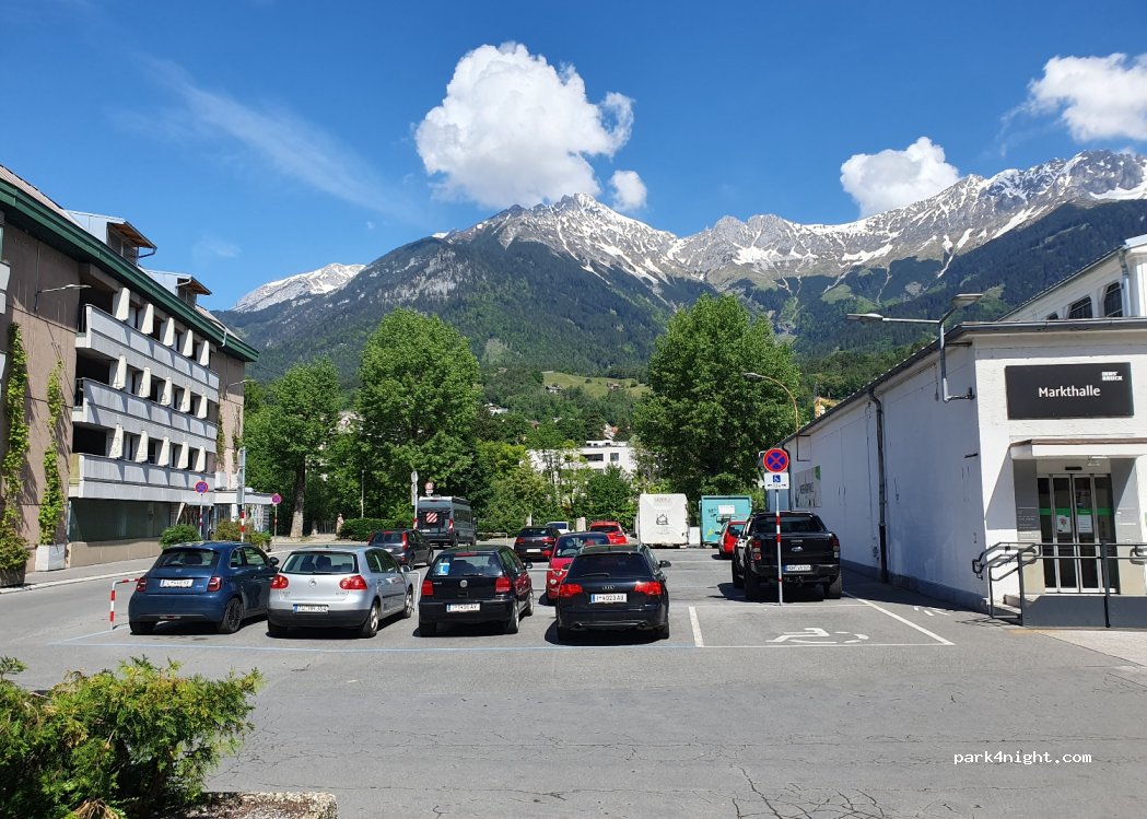 Der Parkplatz neben der Markthalle hat mehrere Stellplätze, die für Camper bis 6m geeignet sind. Perfekt als Ausgangspunkt, in Innsbruck zu bummeln. Höchstparkdauer 1,5 Std für 3€, aber Sonn- und Feiertags unbegrenzt und kostenlos. Übernachtung verboten.