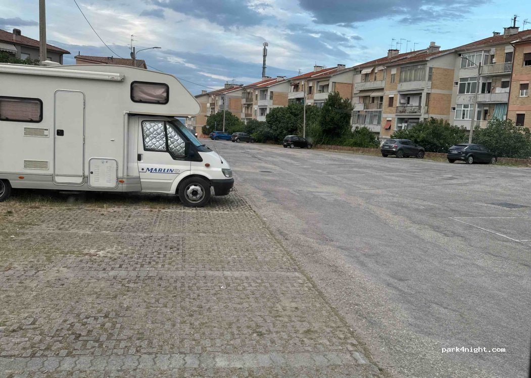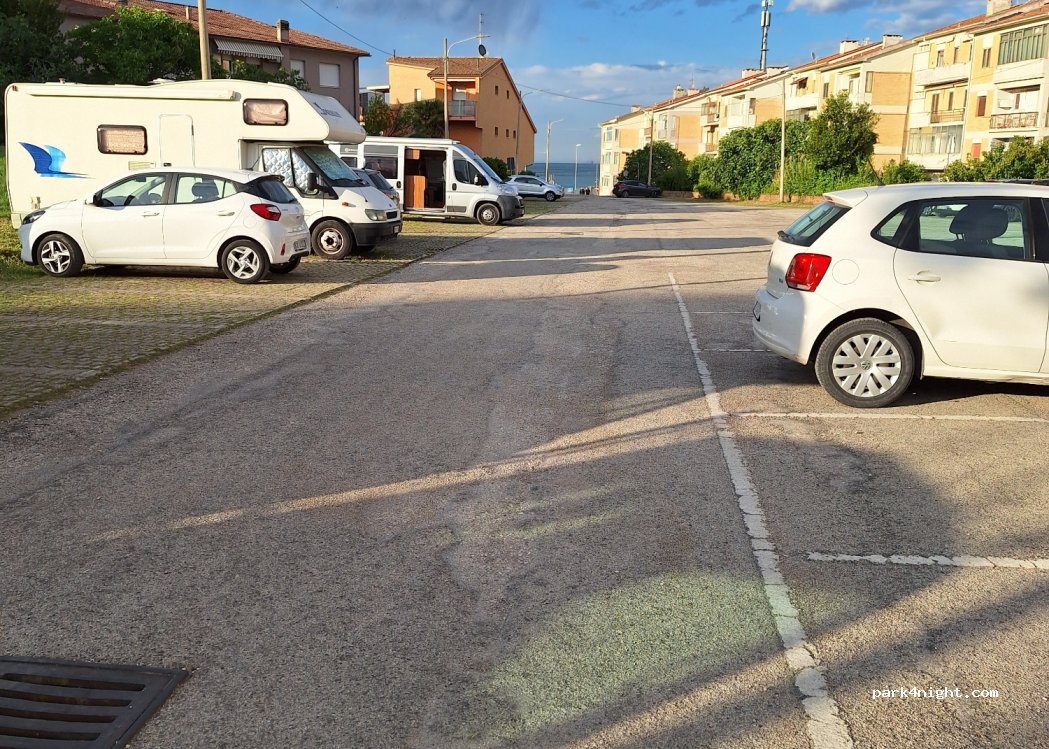 Parkplatz zwischen Häusern, daher recht ruhig. Nicht schön, dafür gratis. Gute Anbindung mit Bus nach Ancona. Viele freie Plätze als ich da war (April 2025)