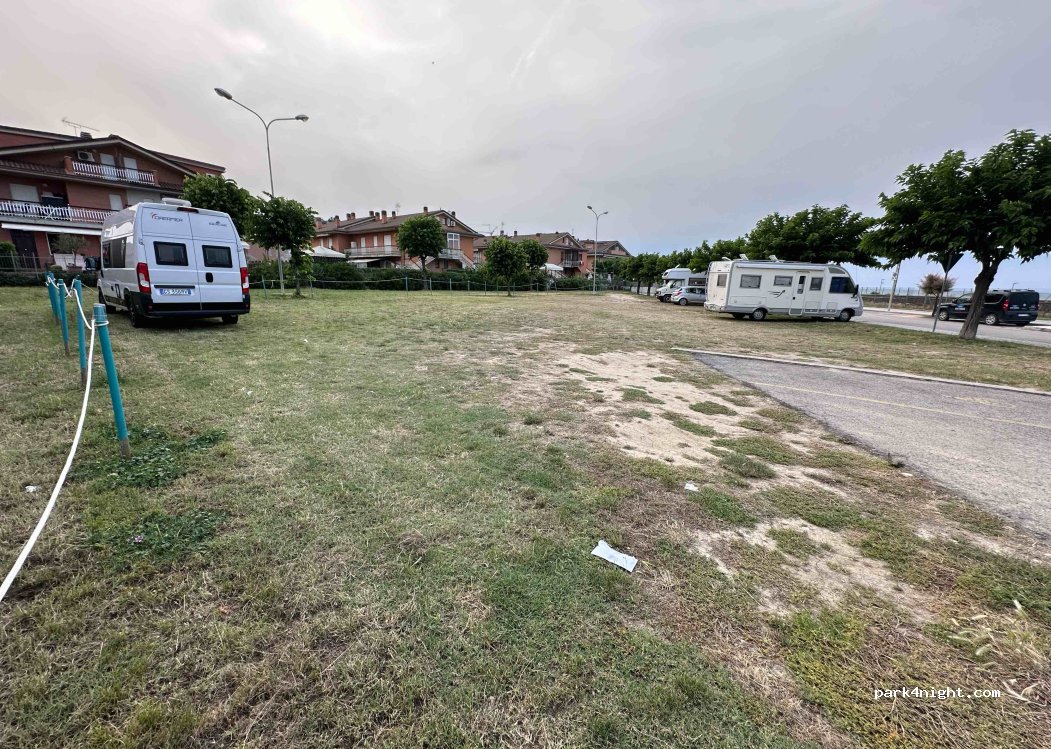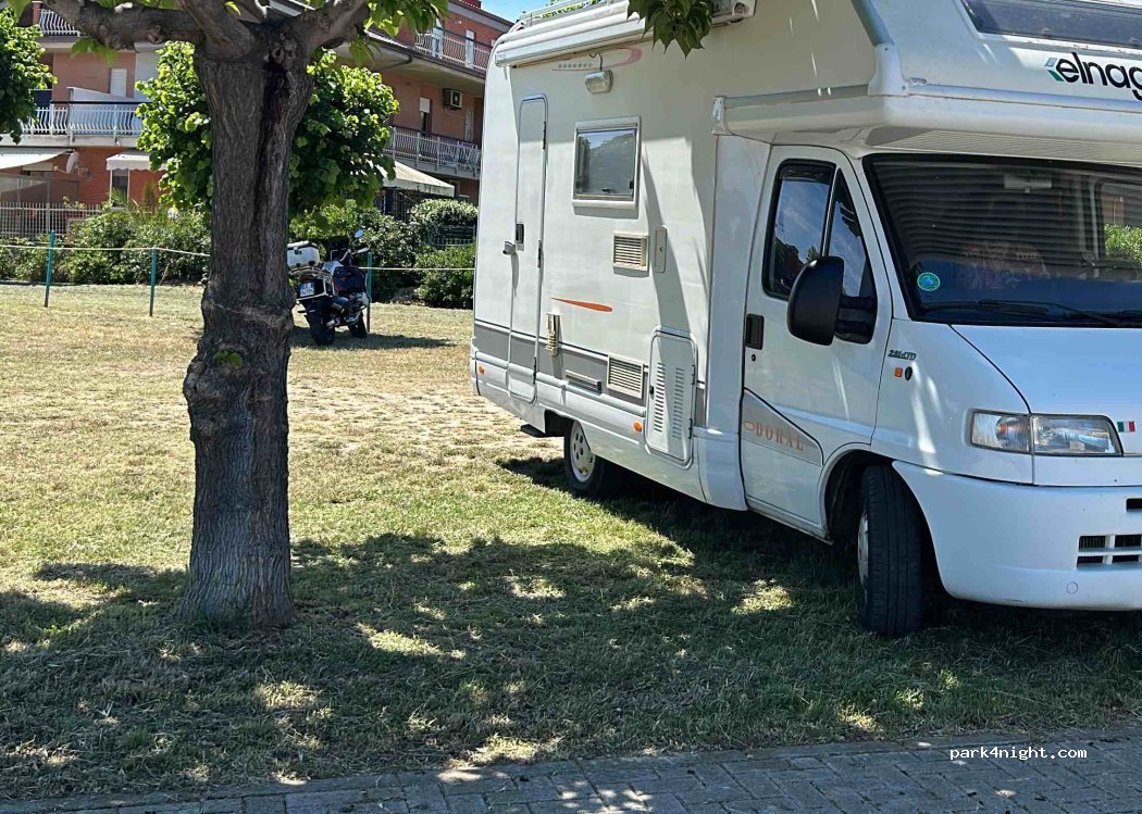 Parcheggio alberato molto tranquillo almeno a maggio. Accesso al mare con bar e lido. Passano i treni anche di notte. Danno fastidio un pochino.
