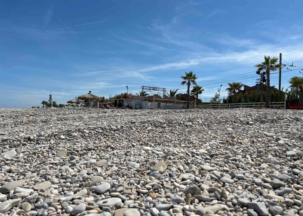 Zumindest im Mai sehr ruhiger, von Bäumen gesäumter Parkplatz. Zugang zum Meer mit Bar und Strandbad. Züge fahren auch nachts. Sie nerven ein wenig.