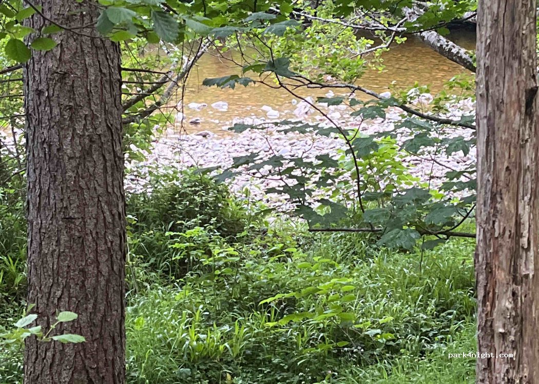 Parking de stationnement dans une route calme. Rivière peu profonde du côté facilement accessible.