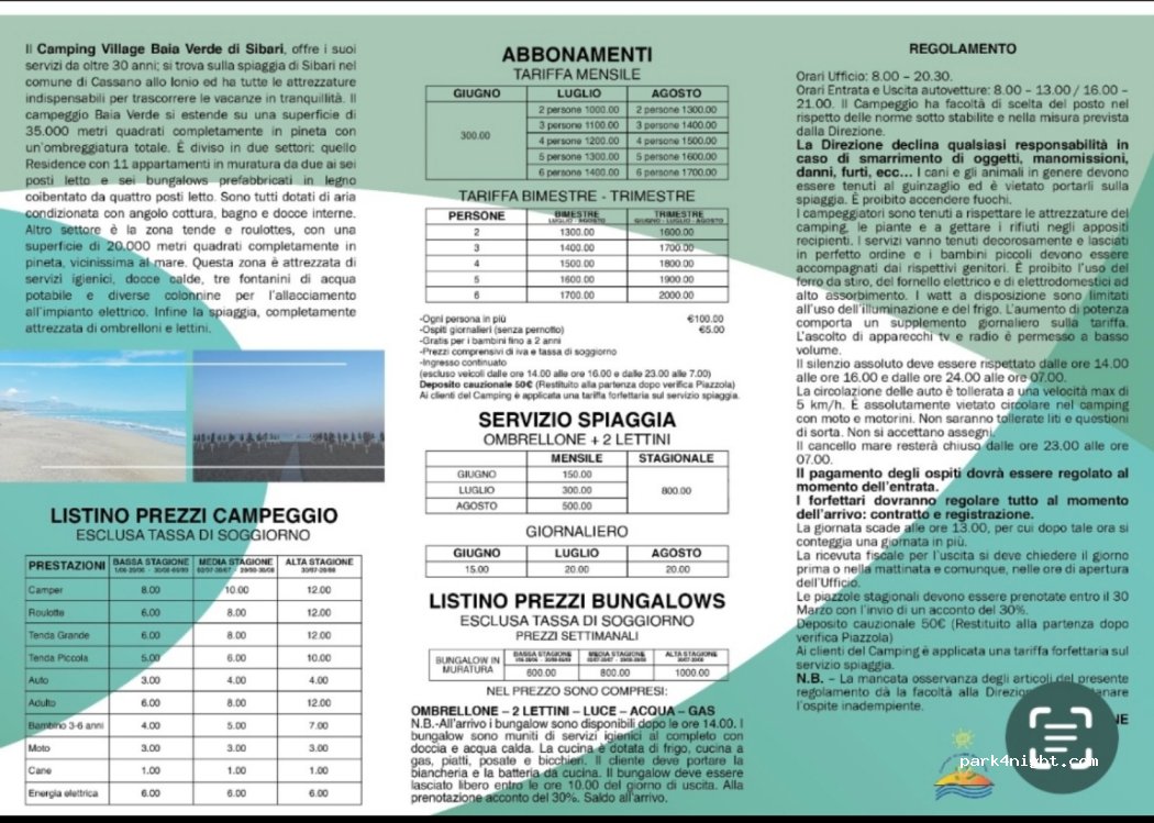 Campeggio molto grande in pineta con accesso diretto alla spiaggia, molti stanziali, pochi servizi offerti, piccolo bar, servizi igienici datati e acqua calda x doccia da gestire ma compresa nel prezzo. Tra L altro acqua con un forte odore di ferro è visibile dai residui nei lavandini, wc e piatto doccia..se non si ha bici o altro mezzo diventa difficile raggiungere il centro di Sibari. Ok x una paio di giorni di mare, gestori cordialissimi