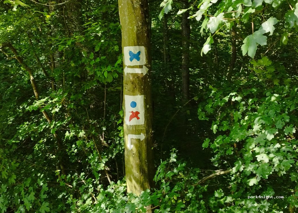 Le petit parking de randonnée se trouve en lisière de forêt. Il dispose de quelques espaces pour la taille d'une camionnette. Deux des emplacements sont presque plats. Le week-end (la photo a été prise dimanche), des promeneurs de chiens et des randonneurs viennent.