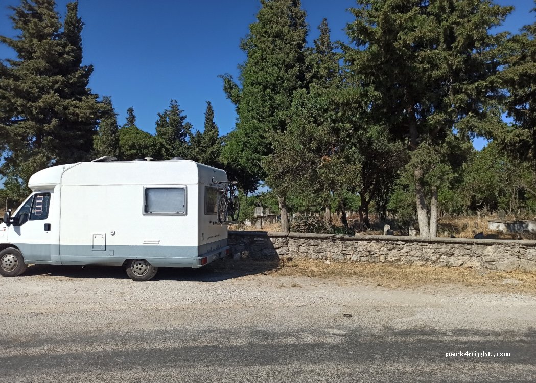 In front of the cemetery opposite the gas station. spent a quiet night, little traffic. Right opposite there is a drinking water tap, a pissoir and a toilet, closed, the key to which you probably have to ask at the station. In the shade in the afternoon.