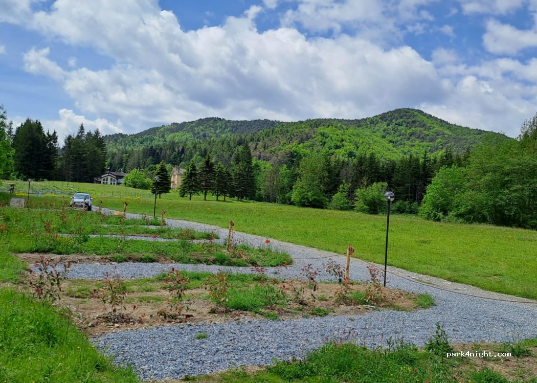 Neuer Wohnmobilbereich zur Erweiterung des Alpino-Campingplatzes. Eingebettet in die Natur zwischen Wiesen und Wäldern, nahe der Nationalstraße 28, aber abseits vom Verkehr; Die Stellplätze sind groß und ermöglichen das Öffnen der Markise und das Aufstellen von Tischen. Leistungen: Wohnmobilservice, 6-Ampere-Strom, Toiletten, Duschen, Waschbecken und Grill! Ein Tennisplatz, ein Restaurant und eine Bar gehören ebenfalls zum touristischen Komplex.