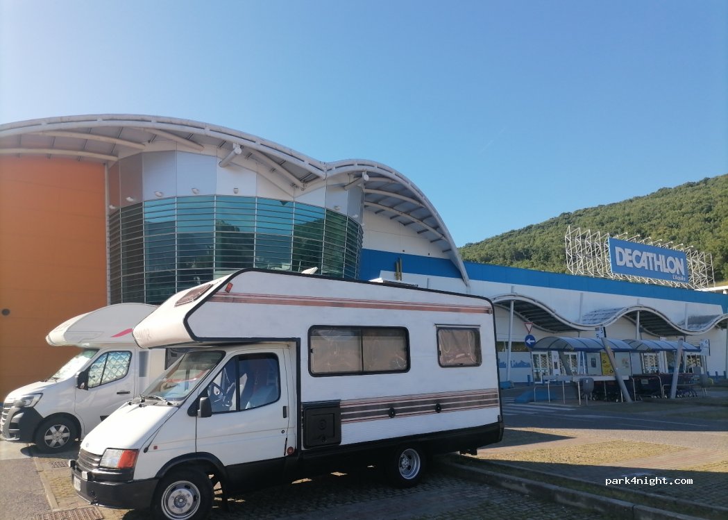 Parking in front of Decathlon, illuminated, flat, we also found other campers there who spent the night. All food and laundry services at the mall. I recommend entering from the car park that leads to the Brico center because it is easier, the other entrance that leads to the petrol station is a bit narrow to maneuver when you enter the shopping center car park on the right.
