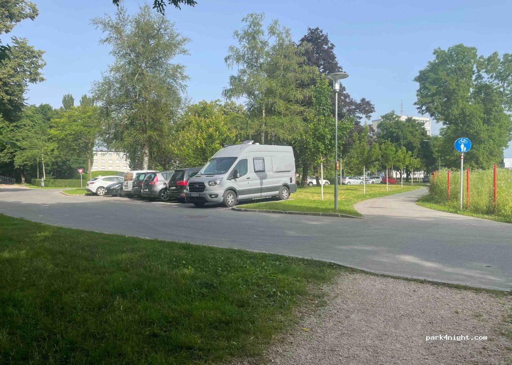 There are several parking lots next to a little park with a pond. It's close to the train station, but it is very quiet. Good place for one night