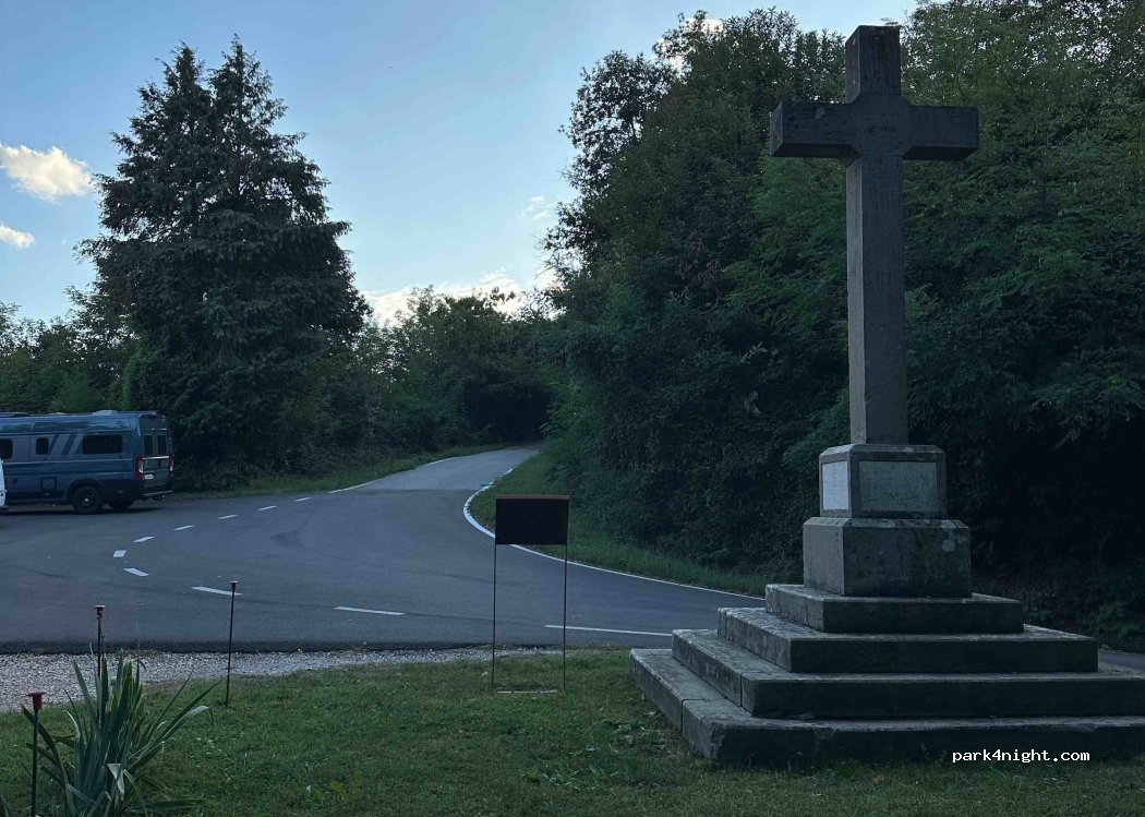 Almost flat location for a van on the edge of a hiking departure parking lot. Very pleasant shade and wind on hot days, very very quiet in the dark and almost complete silence. In the morning and evening mountain bikes pass and the parking lot seems to be overflowing with people going to the hermitage. It's billed as a belvedere but the trees block the view.