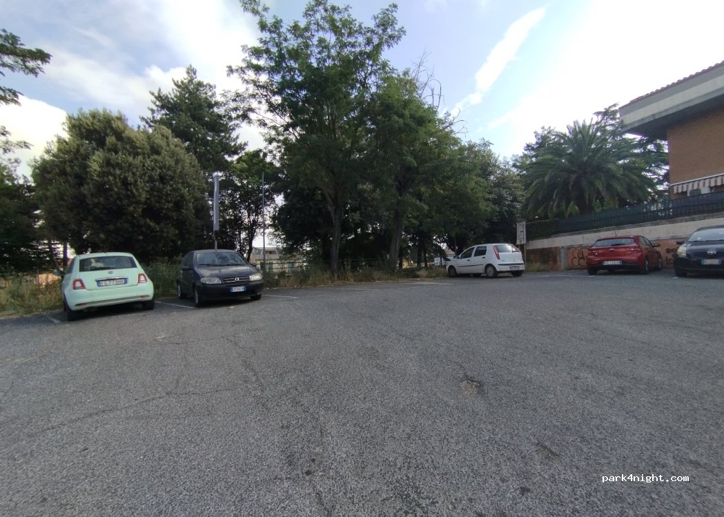 Parcheggio gratuito non servito accanto a un parco con scivoli e altalene. Molto traffico e gente che porta a spasso i cani.