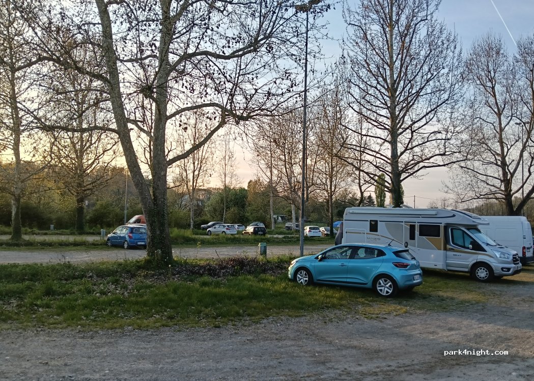 Es un aparcamiento con árboles altos. Pasean por medio decenas de gallinas y gallos. Bajando a un minuto, la pista de bicicletas a la orilla del Adda. 2 pizzerías en esa pista. Muy tranquilo para dormir aunque te despierta a eso de las 5:30 el gallo y a las 7:30 las campanas de la iglesia