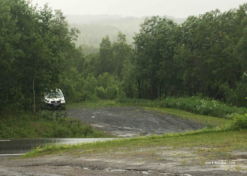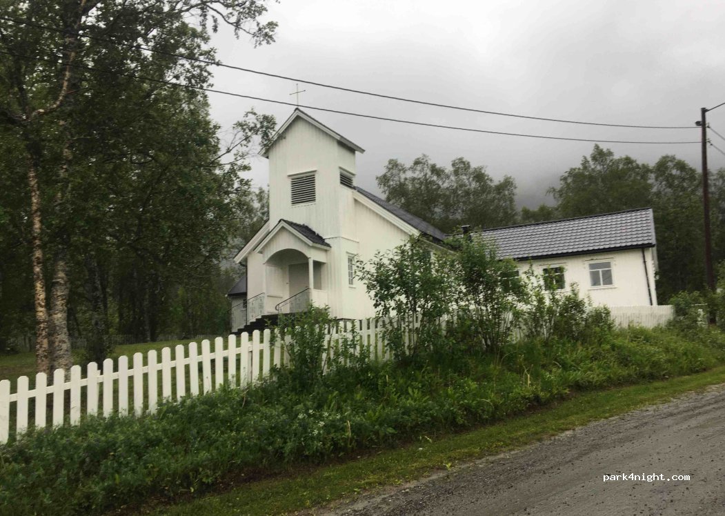 Small dirt car park, opposite the church on the other side of the road (avoid the one next to the church, it's not very well seen!). There is also another location 30m before. Very helpful locals told me that we could drink water from the nearby stream. Path for walking a dog. Sami Museum 1km away.