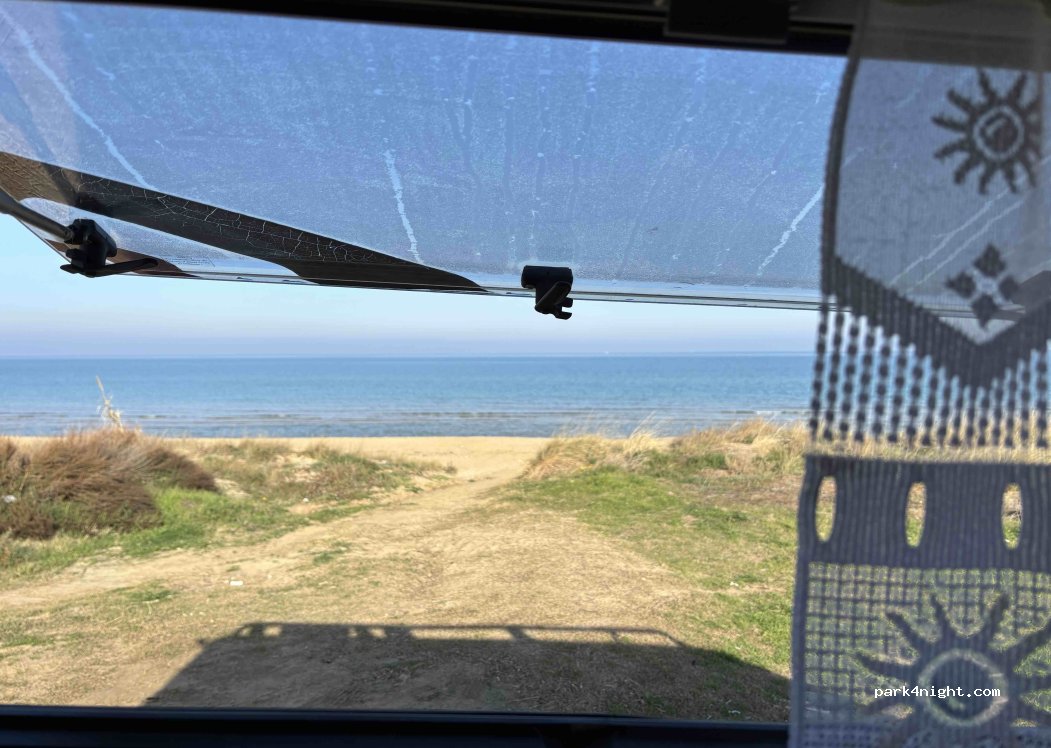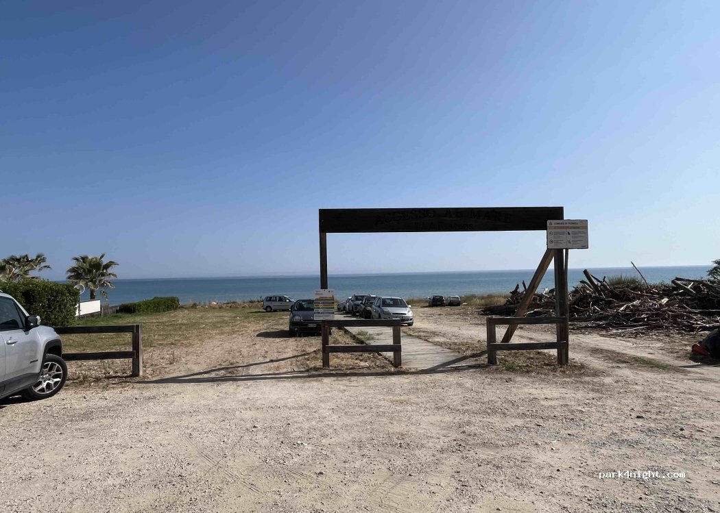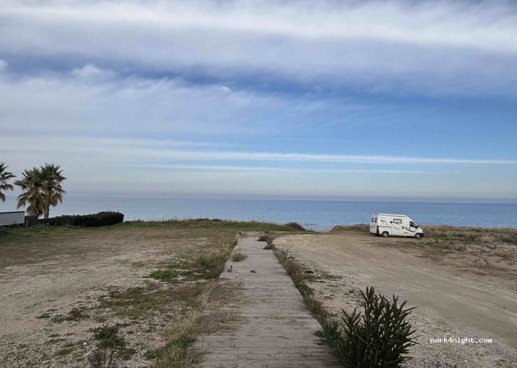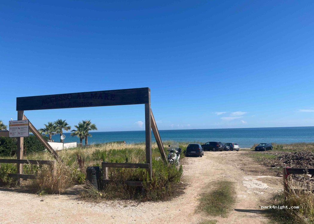 parcheggio direttamente sul mare, ci siamo fermati nonostante il divieto di campeggio e non abbiamo avuto problemi. parcheggio frequentato sia di sera tardi che alla mattina presto dai pescatori, la ferrovia è attaccata e si sente un po' di rumore. svegliarsi a bordo spiaggia però è impagabile!
