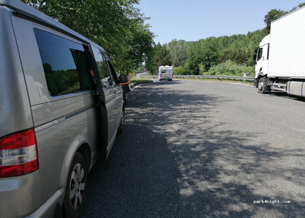 Pequeño aparcamiento junto a la autopista, un poco sombreado entre el mediodía y las primeras horas de la tarde. No es tranquilo debido a la proximidad de la carretera y a algún que otro vehículo que pasa buscando sombra, ¡pero es mejor que nada!
