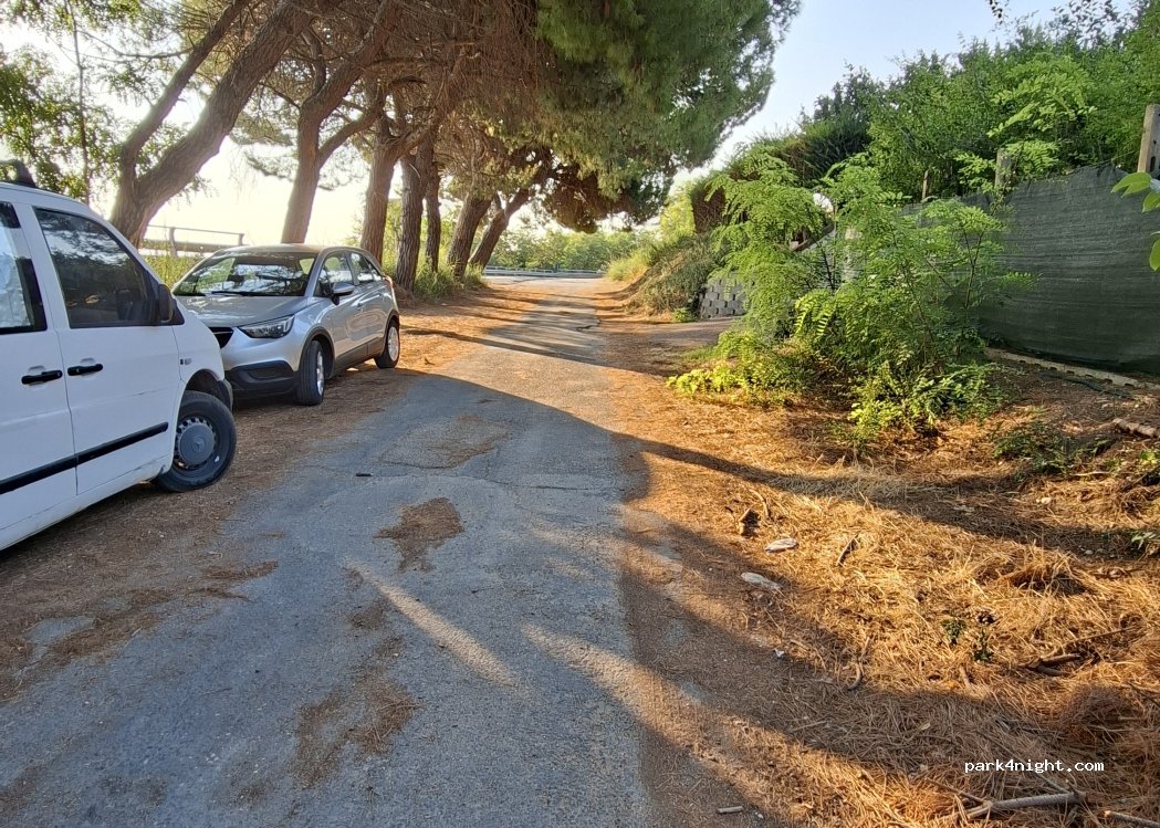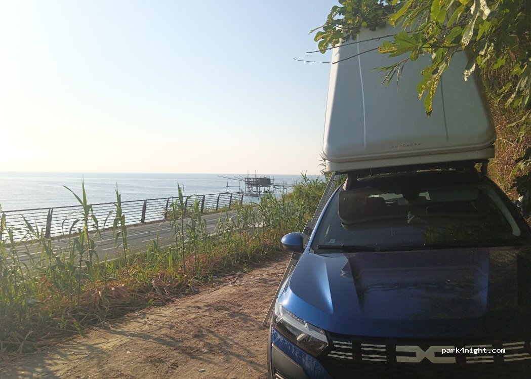Piccoli parcheggi dopo il ponte. La gente parcheggia si giorno per andare al mare a fare il bagno e pescare. Di sera è molto vicino ad un trabocco con ristorante. Molto tranquillo e silenzioso. Di giorno passano persone accanto sulla pista ciclabile. Consigliato.