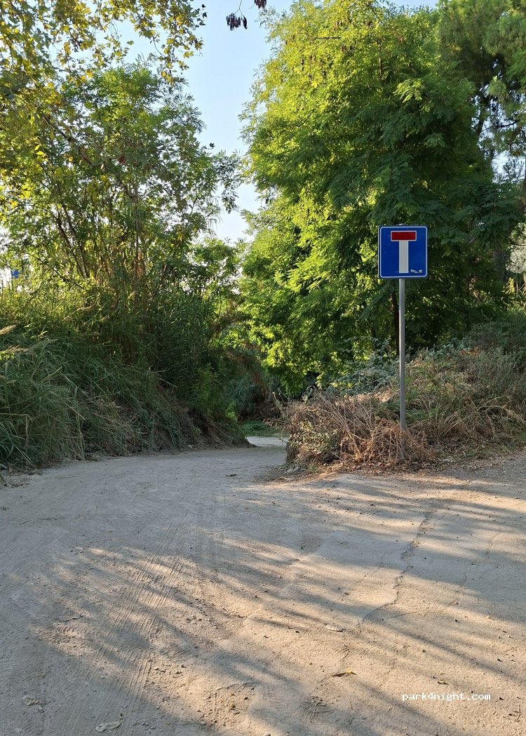 Small car parks after the bridge. People park every day to go to the seaside to swim and fish. In the evening it is very close to an overflow with a restaurant. Very peaceful and quiet. During the day people pass by on the cycle path. Advised.