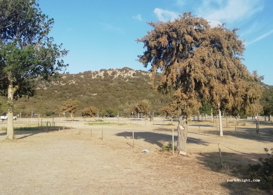 Nice paid parking of sand and grass, for cars and campers in the middle of nature with some trees. Very quiet and quiet at night, there is no light at night but you can see the stars great. Good access and very spacious. One night I was with another camper and another night alone. Next to the beautiful Su Gardieu beach and 5 minutes from Cala Cipolla. Chemical toilets in front of the car park. The guard arrives at 8 am. I arrived late at night, there was no one there and I paid when I left in the morning. During the day there are beach bars where you can eat and drink on the beach. The parking lot is separated from the beach by beautiful dunes.