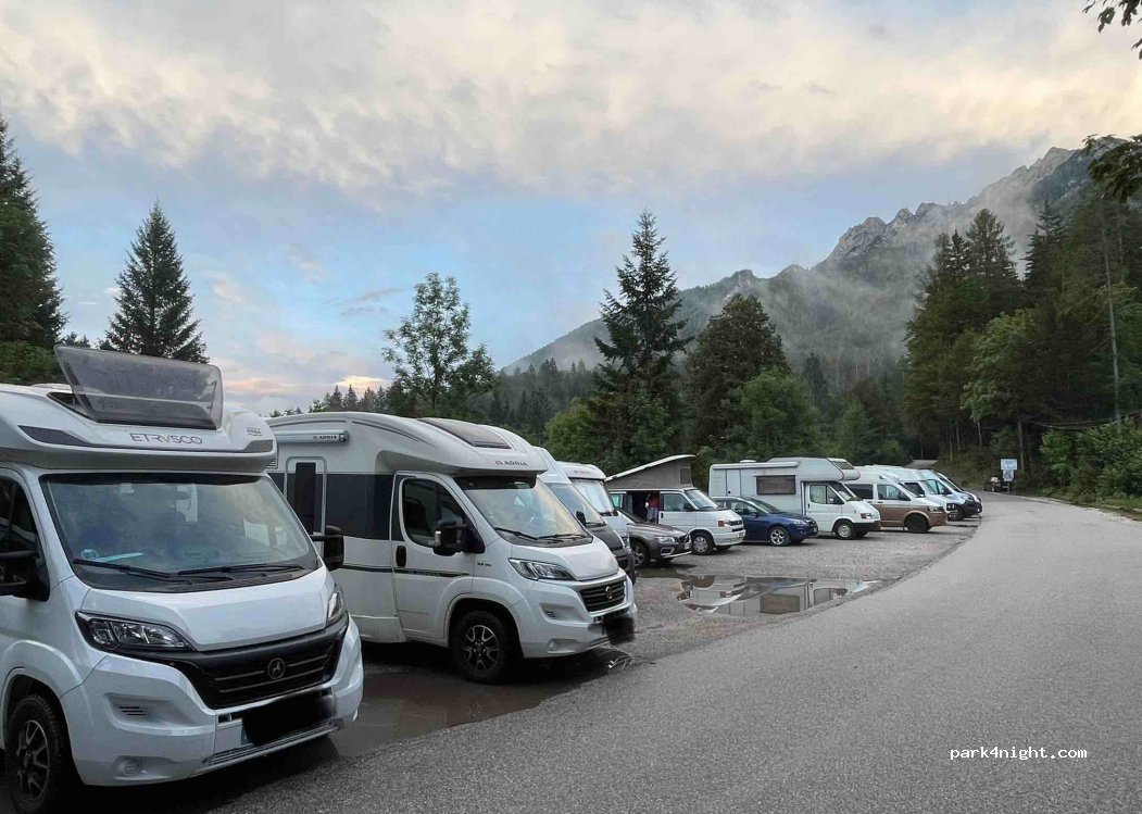 Lo usamos como alternativa a dormir en Eslovenia, muy cerca de la frontera, dónde está prohibido pernoctar y muy vigilado debido a la cercania con el Parque Nacional. Como no hay ningun cartel que lo prohiba nos quedamos una noche junto a otros dos campistas, nadie nos dijo nada y no tuvimos ningun problema. Tranquilo y cerca de los lagos de Fusine