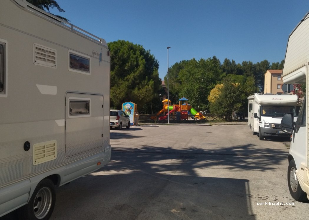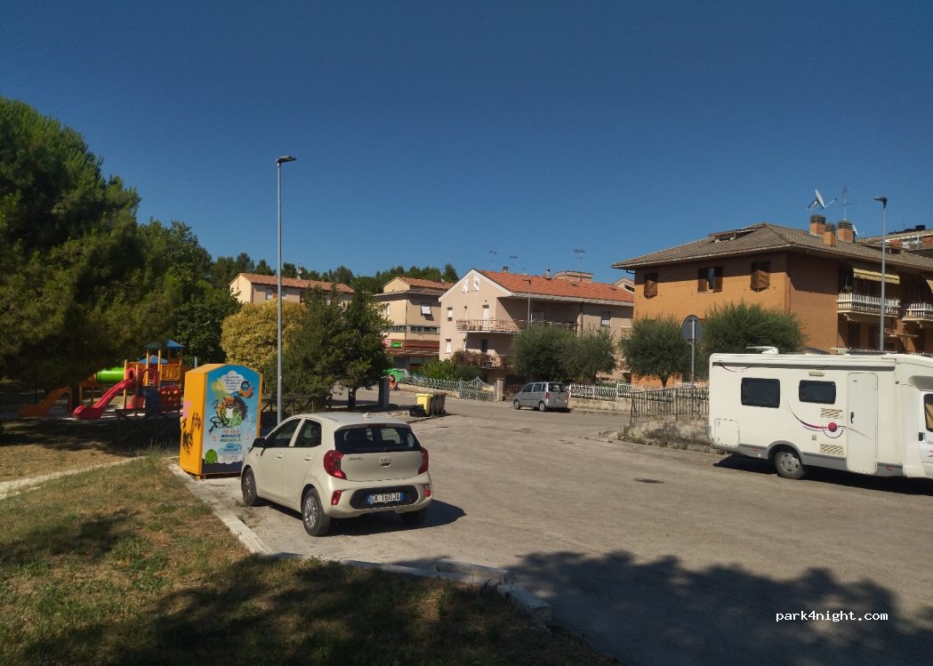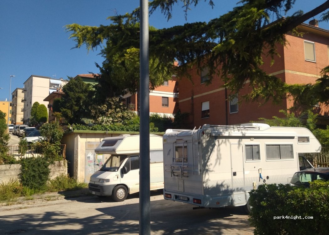 Parcheggio in zona residenziale tranquilla alla fine di una strada. Accanto a un parco giochi, un supermercato e un negozio che vende gas per cucinare. C'è anche un bar/pub a poche centinaia di metri. A circa 20 minuti a piedi (1 km) dal centro della città di Macerata