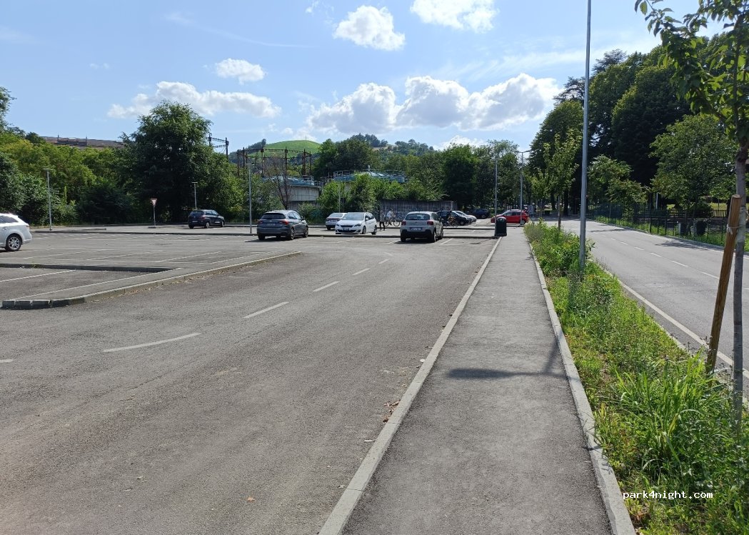 Calme la nuit, espaces de 6 mètres mais dévers possible, gratuit le temps que ça dure, Excellent boulodrome à côté avec parc, padel, mini golf, ping-pong,... et toilettes, fontaine H2O dans le parc, merci de le laisser propre !